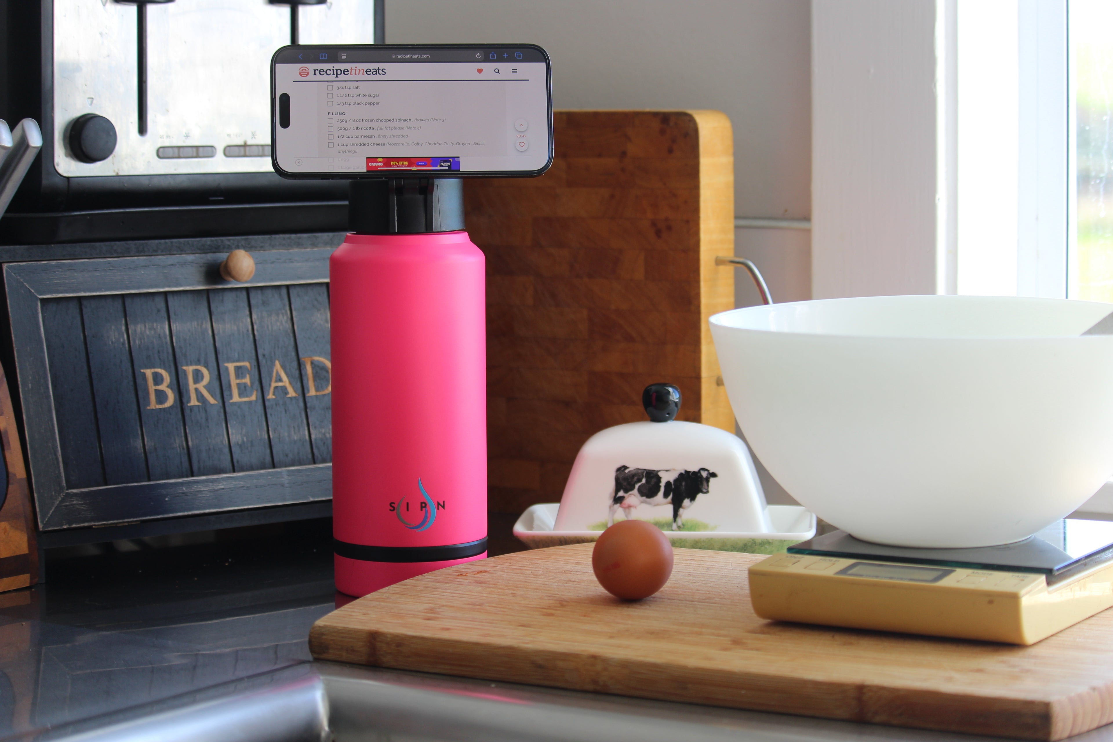 SIPN bottles remain balanced even when empty! Our bottles have a magnetic ring on the lid so that you can SNAP your phone into place and use it to hold your phone to record a gym workout, support you while you take a handsfree meeting, hold your phone while you read recipes in the kitchen... The options are endless!